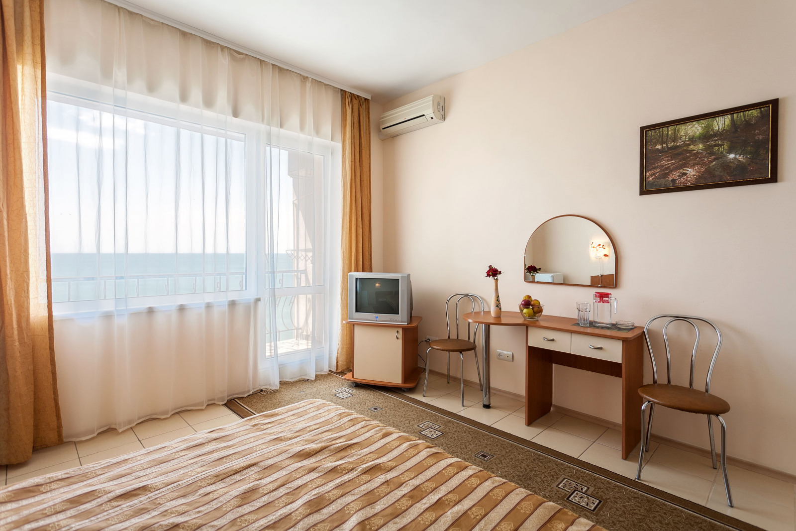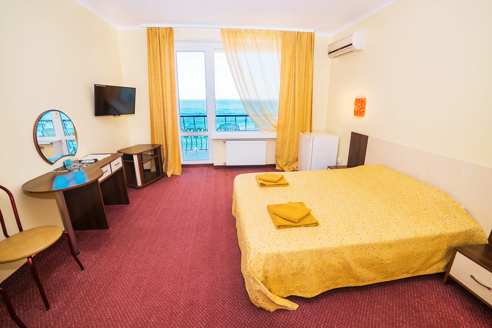 Площадь номера - 23 кв.м. 2 осн. места. 2 доп. места. Балкон. Мебель: кровать двуспальная, прикроватная тумбочка, столик журнальный, столик туалетный, стулья, шкаф. Оборудование: кондиционер, сейф, телевизор, холодильник. Санузел. Сервис: смена полотенец (1 раз в 3 дня), смена постельного белья (1 раз в 5 дней), уборка номера (ежедневно).